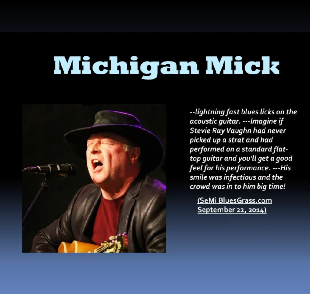 Michigan Mick is a blues-rock guitarist, singer, and songwriter from Detroit, known for his gritty vocals and fiery guitar work. He’s toured across the USA and Europe, represented the West Michigan Blues Society (2024) and the Detroit Blues Society (2025) at the International Blues Challenge in Memphis, and has performed with legendary guitarists, Jim McCarty (Mitch Ryder and The Detroit Wheels/Cactus/The Rockets) and Alvin Lee (10 Years After)
